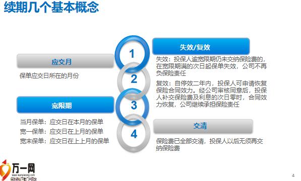简说续期公司按期交保单保险合同约定收取除首期保险费以外其余各期保险费的行为什么是续期,保单应交日所在的月份,当月保单:应交日在本月的保单宽一保单:应交日在上月的保单,宽末保单:应交日在上上月的保单失效:投保人逾宽限期仍未交纳保险费的,在宽限期满的次日起保单失效,公司不再负保险责任,复效:自停效二年内,投保人可申请恢复保险合同效力。经公司审核同意后,投保人补交保险费及利息的次日零时,合同效力恢复,公司继续承担保险责任,保险费已全部交清,投保人以后无须再交纳保险费续期几个基本概念指标定义指标功用,反映长期类期交保单在各年度的存续状况;寿险公司经营管理以及资本市场考验寿险公司的价值的关键性指标; 它不仅反映寿险公司的赢利能力,也是公司持续有效经营的基础,是公司的利润来源所在 13月保费,继续率13月保费继续率,统计月前14个月生效的保单在统计月仍然有效的保单保费占比13月继续率13月保费继续率统计月前14个月生效,截至统计月仍然有效的保单保费之和,统计月前14个月生效的保单保费之和×100%机构的13月保费继续率具体介绍,13个月只是行业术语,准确地说应该是14个月即一年12个月加2个月宽限期1. 分母保单:不含保单状态为契撤、死亡理赔、到期终止的所有承保长期险期交保单。年交保单,保费为保单生效时的承保保费(不含追加保费);小交别保单,按年化保费统计。件数继续率按保单号统计主险件数,一个保单号为一件。2. 分子:保单状态生效、交费状态已交的实收保单;以及状态为生效但无实收的免交、交清保单(不含减额交清)。分子为应交的期交保费, 小交别保单,按年化保费统计。3. 统计所有渠道保单:银行保险、个险代理人、电话销售、代理行、代理商、网络销售。4. 续期保单收费有两个月宽限期,13个月继续率统计月的保单对应生效月为t-14月。5. 年累计指标统计保单的生效月为上上年11月-上年10月。计算公式: 统计口径: 举例: 2016年5月(t) 的13月继续率统计保单:2015年3月1日—3月31日(t-14个月)生效的保单,分子: 2016年5月31日前已交保费合计95万元分母: 2015年3月1日至2015年3月31日生效保费合计100万元机构的13月保费继续率具体介绍2016年5月的13月继续率: 考察期间内承保的寿险新契约于生效后第十三个月的实收保费(含附加险)考察期间内承保之寿险新契约保费(含附加险)×100%财富队伍个人的13月保费继续率具体介绍1. 分子分母包括退保终止件,不包含主险趸交件、理赔终止件、主险交费期满件、出单前契撤件、犹豫期退保件、主险期满终止件、豁免件。2. 实收保费包括承保首年内新增附险的第二期保费。3. 新契约保费包括承保时的附加险保费,但不包含承保首年内新增附加险的首期保费。财富队伍个人的13月保费继续率具体介绍2016年5月(t)的13月继续率统计保单:2014年4月(t-25个月)至2015年3月(t-14个月)生效的保单分子:2015年4月1日至2016年5月31日期间内实收的第二年保费(含附加险)950万元分母: 2014年4月1日至2015年3月31日生效的新契约保费(含附加险)1000万元注:任何月份统计时都涵盖12个月的保单,每个月均滚动累计2016年5月的13月继续率= Click here to add your text. Click here to add your text. Click here to add your text. Click here to add your text. Click here to add your text.