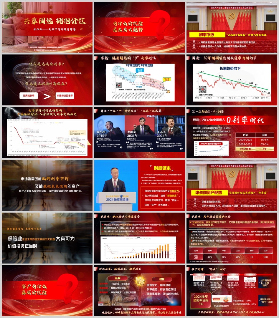 对于客户来说,选择分红险主要有以下几个方面的理由。首先,从经济环境来看,当前经济形势存在一定的不确定性,市场利率持续下行,传统的储蓄和普通型保险产品已经无法满足人们对财富增值的需求。而分红险作为一种能够提供终身固收 + 浮动收益的产品,能够在保障资金安全的前提下,为投资者带来更高的潜在收益。其次,从政策层面来看,国家对保险行业的支持和重视,使得分红险的发展具有了更加坚实的政策基础。投资者可以借助国家政策的东风,通过购买分红险实现财富的稳健增长。