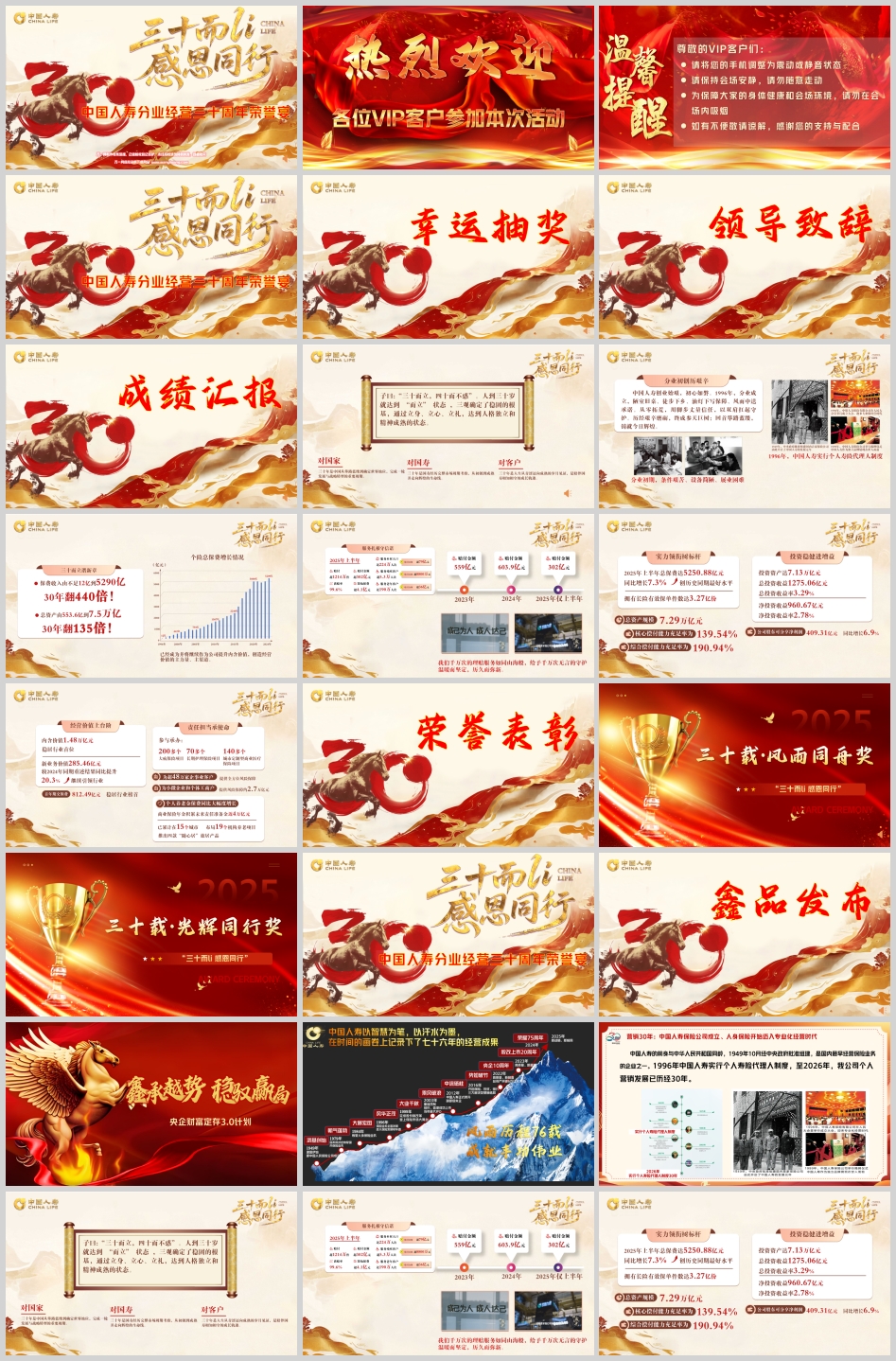 本次的回馈发布邀请了中国人寿无锡市分公司XX先生/女士进行财富发布。发布者以生动的比喻,将国寿的周年回馈比作家庭节日庆祝,通过感恩晚宴的形式与长期支持国寿的客户们共同举杯庆祝。同时汇报了中国人寿的成绩,如2024年全年赔付603亿元,2025年仅上半年,国寿赔付金额已达到302亿元,赔付超1214万件,获赔率99.6%,豁免保费4.1亿元,2025年上半年总保费达到5250.88亿元,同比增长7.3%,投资资产7.1万亿元,总投资收益率3.29%等。还回顾了中国人寿营销30年的发展历程,1996年实行个人寿险代理人制度,这一制度为公司搭建起与客户之间直接沟通的桥梁,个人营销发展迎来30年里程碑,见证了公司从成立到专业化经营的巨大跨越。