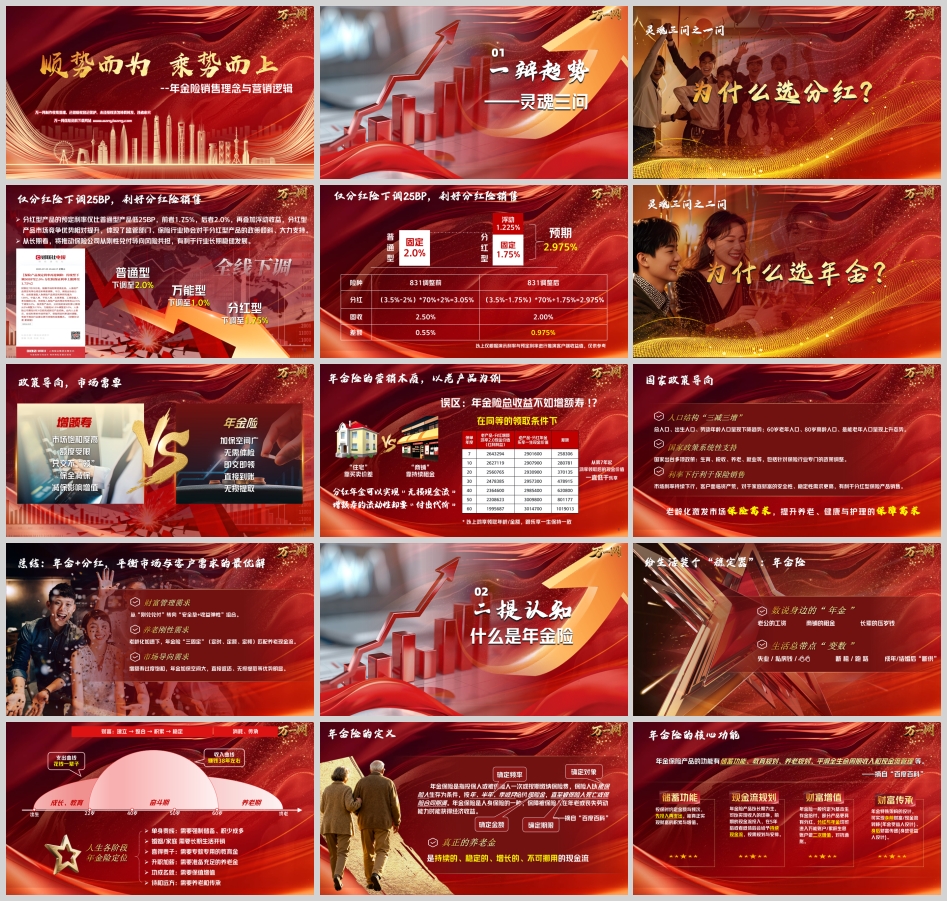 课件开篇便抛出“灵魂三问”,直指销售实践中最根本的困惑:为什么是分红型?为什么是年金险?为什么是现在?