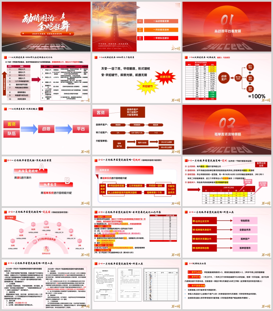 在保险行业进入深度转型期的2026年,如何通过精细化管理和创新经营策略实现高质量发展,成为各大保险公司面临的核心课题。分公司推出的《2026年一季度队伍建设孤单客资流转策略客资分配制度》正是对这一课题的积极探索。这份29页的策略文件,系统阐述了从“战狼平台”实践经验出发,构建队伍建设和客资流转双轮驱动的发展新模式,为2026年一季度及全年业务发展提供了清晰的实施路径。