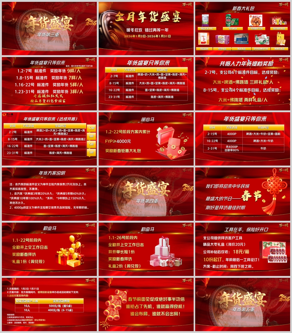 春节,作为中华民族最盛大、最富文化内涵的传统节日,不仅是家人团聚、情感交流的时刻,更是保险行业开展营销、深化客户关系的黄金窗口期。2026年开门红战役即将打响,公司精心策划的新春纳福营销年货方案,以五重盛宴为核心,构建了一套激励充分、层次分明、覆盖全面的营销支持体系。这份长达24页的宣导方案,不仅是一份奖励清单,更是一套战略部署,旨在激发团队潜能,抢占市场先机,实现2026年业务发展的开门红