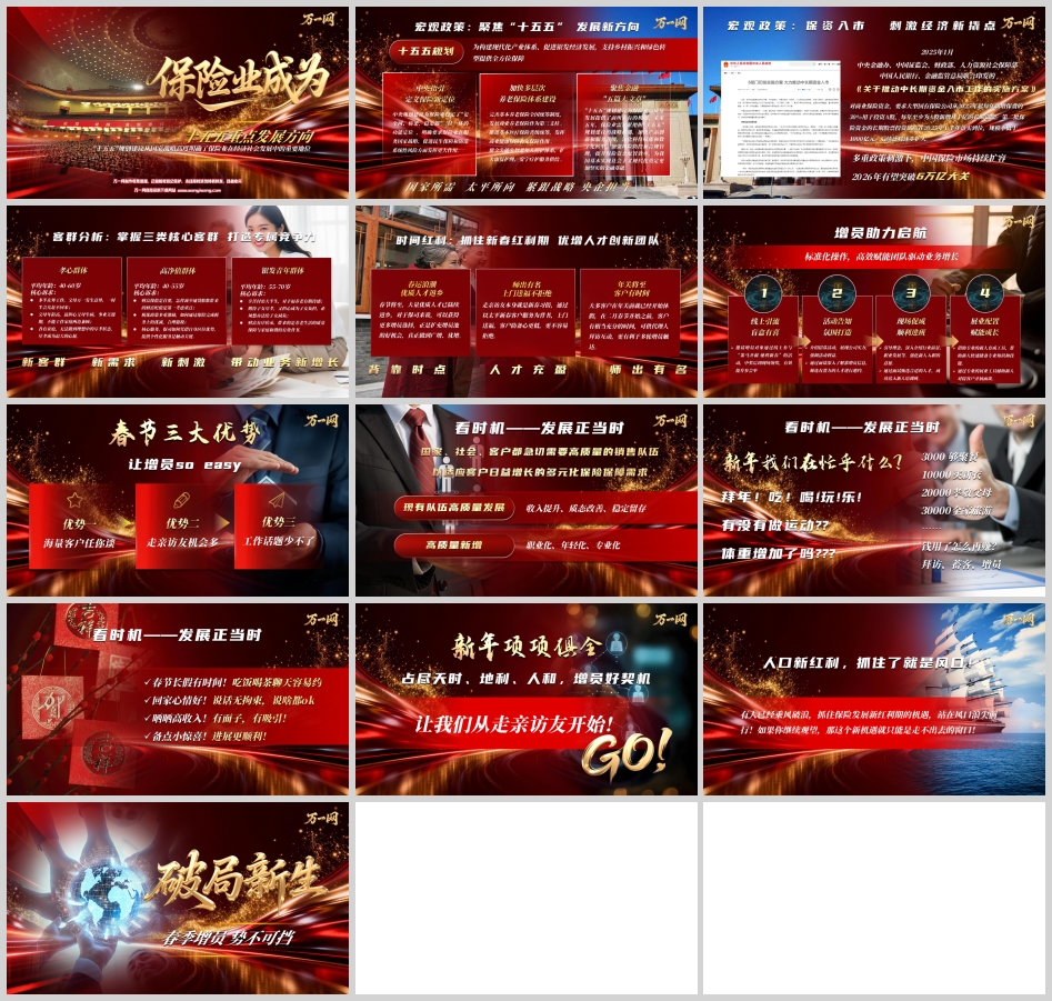 站在“十五五”规划的开局之年,中国保险业迎来了与国家战略同频共振、深度融入经济社会发展大局的关键时期。新春伊始,万象更新,这不仅是一个传统佳节,更是保险行业增员拓客、布局未来的黄金窗口。一份题为《十五五发展新方向2026新春保险优增》的内部资料,为我们清晰勾勒了在宏观政策指引、市场需求变革与时间节点红利的三重驱动下,保险业如何把握新方向,实现高质量人才发展与业务增长。