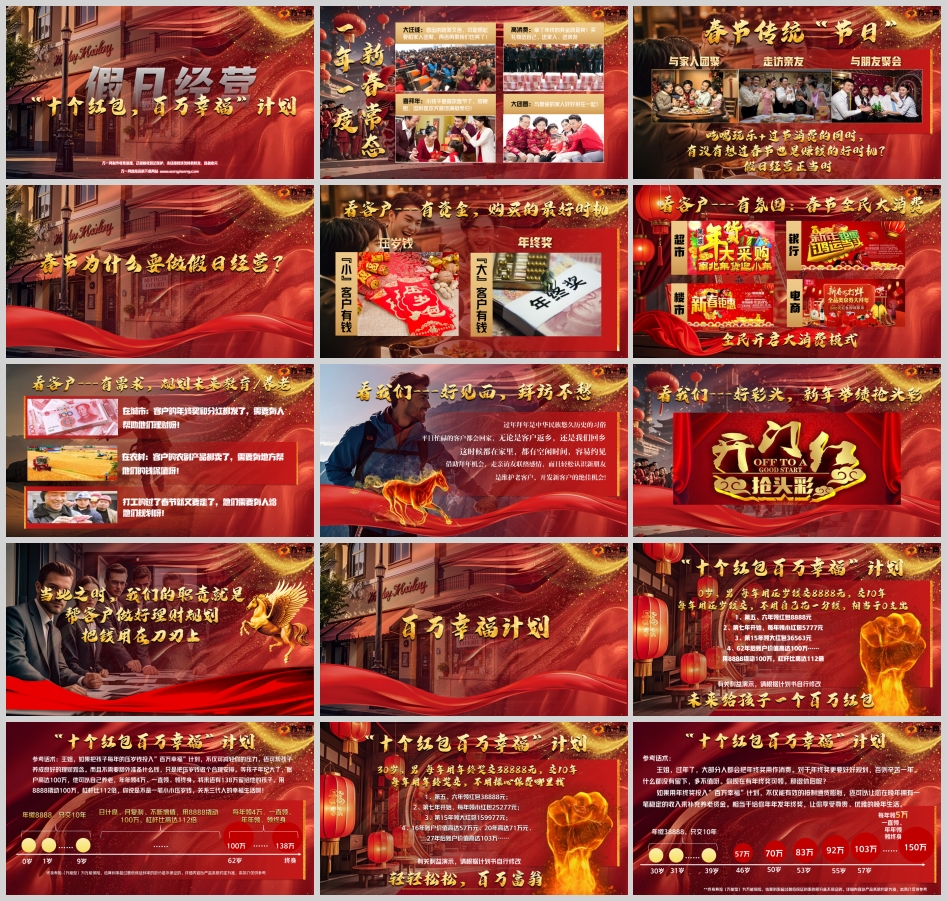 春节,是中华民族最隆重的传统节日。当春运的大迁徙拉开帷幕,当游子们带着一年的疲惫与期待踏上归程,当街头巷尾的年味渐浓——这个承载着团圆、喜庆与希望的节日,不仅是情感的归巢,更暗藏着财富经营的黄金机遇。正如行业人所言:"春节既是全民消费的狂欢季,也是客户资金最充沛、需求最旺盛的‘财富窗口期’。抓住这一节点,以‘十个红包,百万幸福’计划为抓手,既能满足客户对资金规划的核心诉求,更能实现假日经营的业绩突破。"