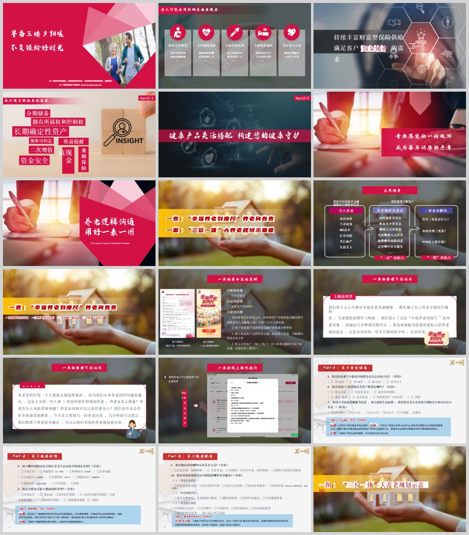 核心目的: 通过客户的答案,判断其对养老的认知水平、资金准备情况、风险关注点以及服务偏好,为后续导入“三位一体”的解决方案铺平道路。