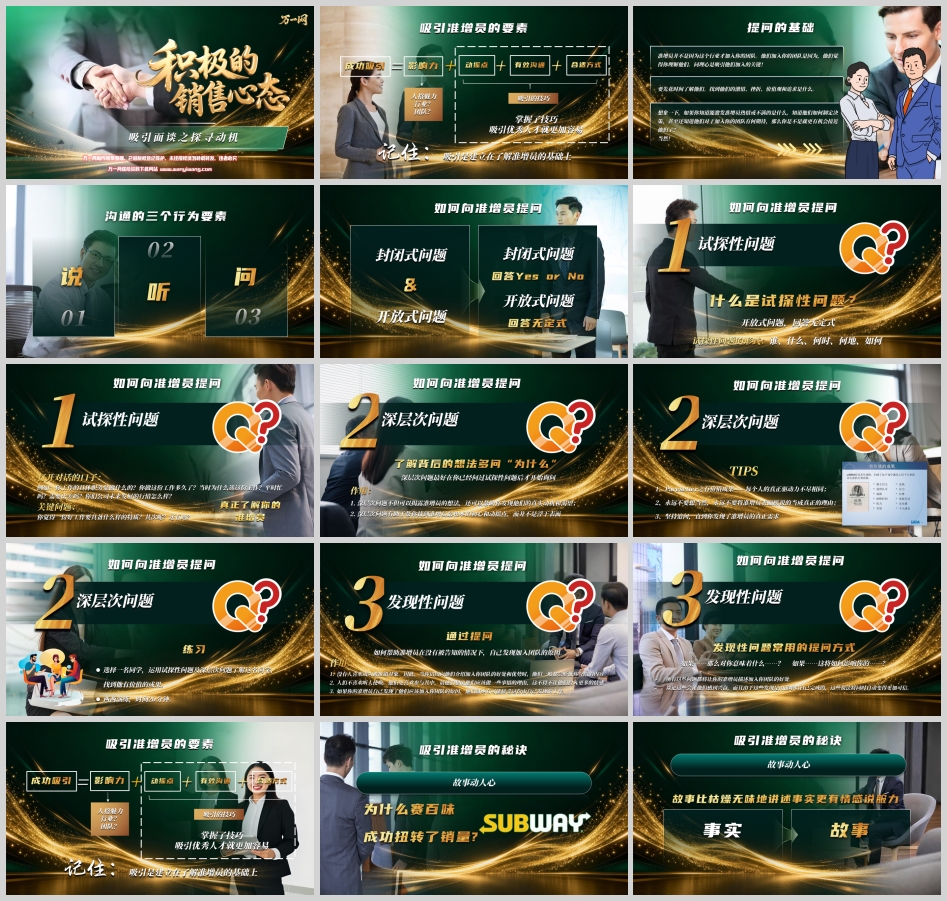 有效的沟通是吸引的核心工具,而提问则是沟通的“手术刀”。材料中将提问分为三类:试探性问题、深层次问题、发现性问题,三者环环相扣,逐步揭开准增员的真实动机。