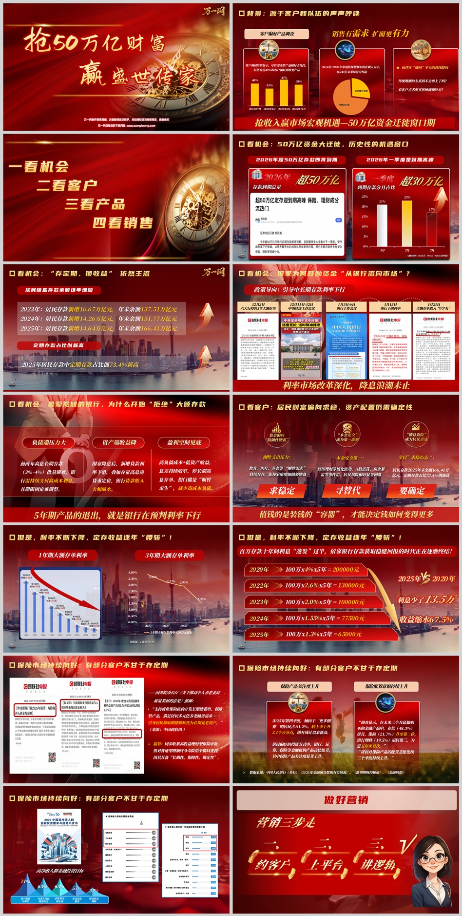 1. 看宏观:利率下行是大势所趋。展示近5年存款利率变化曲线,让客户直观感受“利息腰斩”的事实。