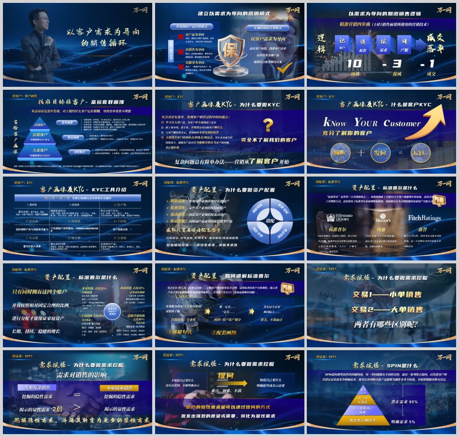 综上所述,“精准营销四步曲”——识客户(KYC九宫格)、谈配置(标准普尔)、挖需求(SPIN)、讲产服(FABE)——构成了一个完整的以客户需求为导向的销售循环。